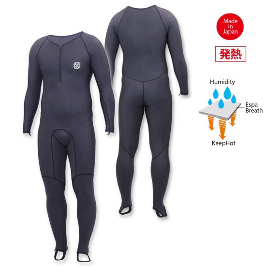 吸湿発熱吸湿効果のブラックライクラ起毛素材を全身に使用した起毛インナー とくにDRYスーツなど高い保温性を求めるモデルのインナーにおすすめ フロントには着脱が楽に行えるようファスナーが取り付けてられている。