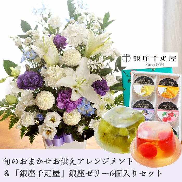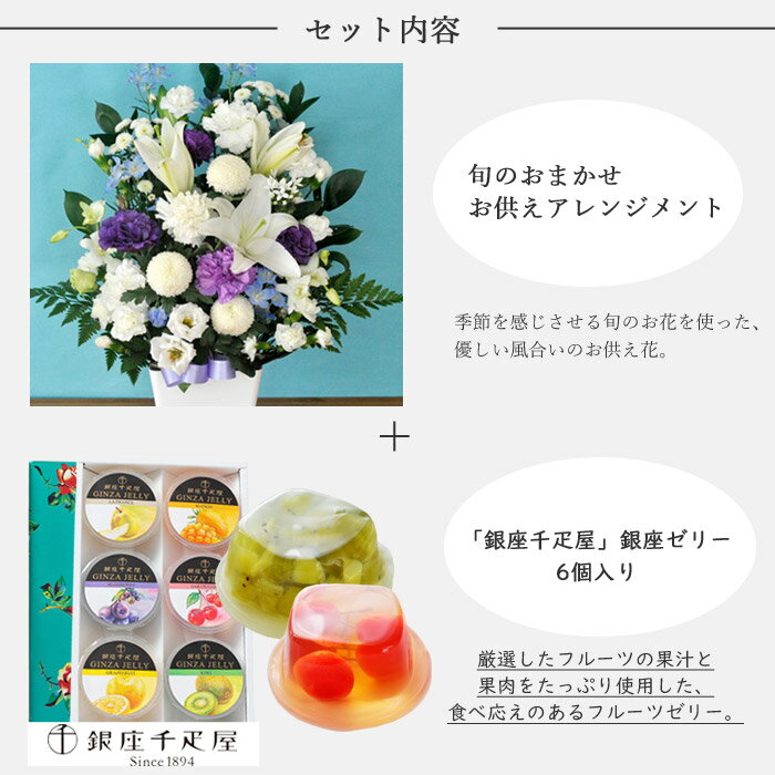 商品詳細 【旬のお供えアレンジメント】 アレンジ:幅約40×高さ約50cm 【「銀座千疋屋」銀座ゼリー6個入り】 内容量:ブルーベリー、さくらんぼ、グレープフルーツ、ラ・フランス、マンゴ、キウイ(各75g)×各1個 賞味期限:製造日から9か月(常温) 保存方法:直射日光、高温多湿を避けて保存。